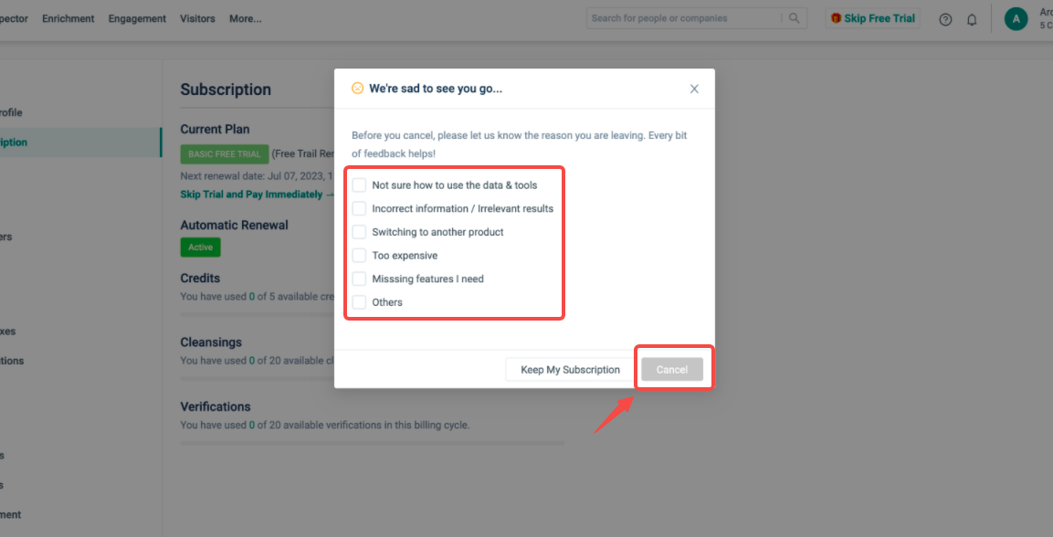 After canceling your subscription plan, you can continue to utilize any remaining credits until their expiration date. Even though your subscription may no longer be active, we want to ensure that you can make the most of the credits you have already purchased. This allows you to fully utilize the resources you have invested in and maximize your experience on our platform until the credits expire.