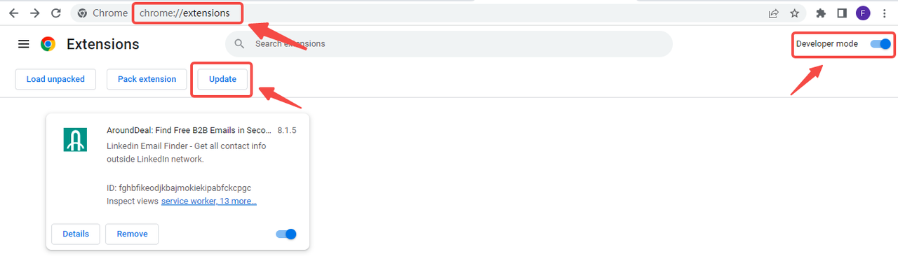 To ensure the AroundDeal extension is up-to-date, enter "chrome://extensions/" in the browser's address bar, enable Developer Mode in the top right corner, and click the Update button at the top of the page.
