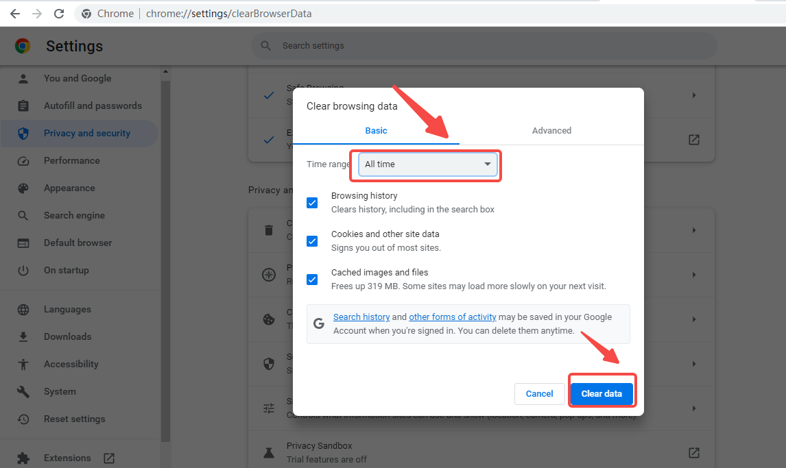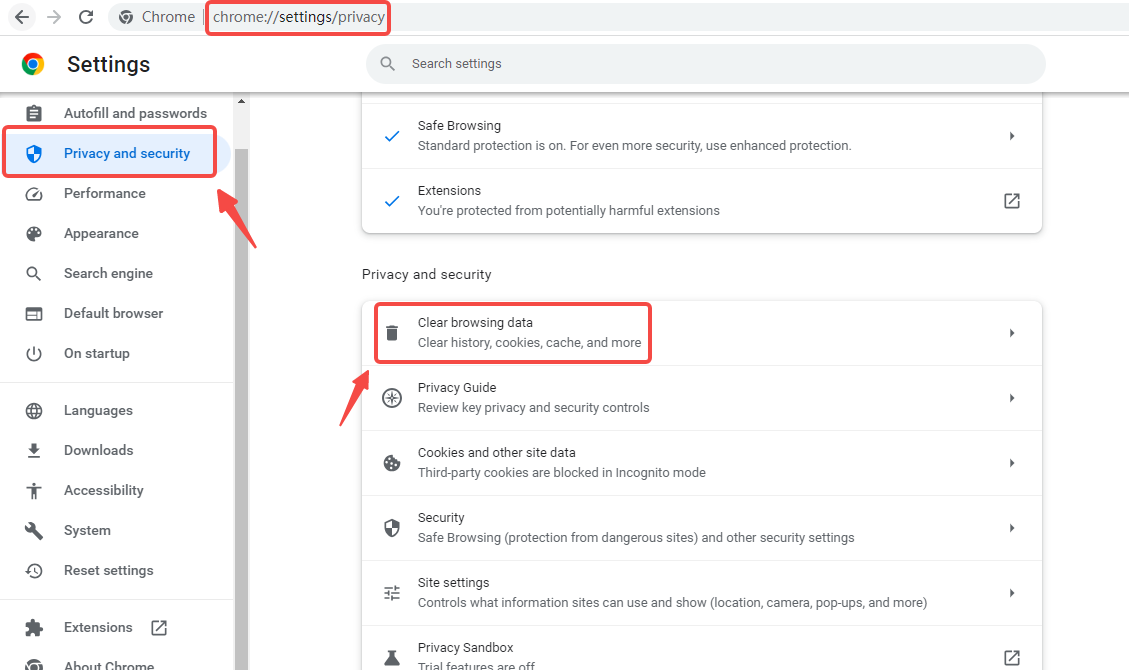 To clear the entire browser cache, enter "chrome://settings/privacy" in the browser's address bar. Click on "Privacy and Security" and then select "Clear Browsing Data."