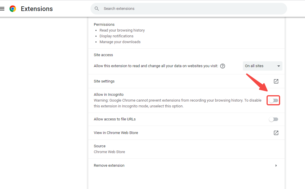 To allow the AroundDeal Chrome Extension to run in incognito mode, go to the Details menu, scroll down to "Allow in Incognito," and toggle the switch.
